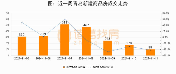 根据青岛市住房和城乡建设局数据显示,2024年11月11日青岛新建商品房成交99套,较昨日减少71套,环比下降41.8%