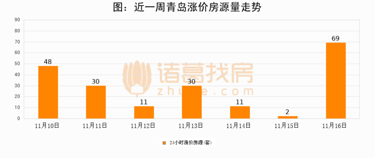根据诸葛找房数据显示,青岛24小时涨价房源量为69套,较11月15日增加67套,环比上涨3350%。与此同时,涨价房源占比小幅扩大,业主信心有所提升。