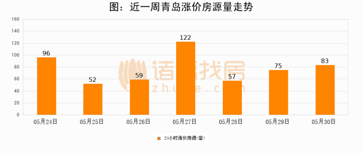 根据诸葛找房数据显示,青岛24小时涨价房源量为83套,较05月29日增加8套,环比上涨10.7%。与此同时,涨价房源占比小幅扩大,业主信心有所提升。