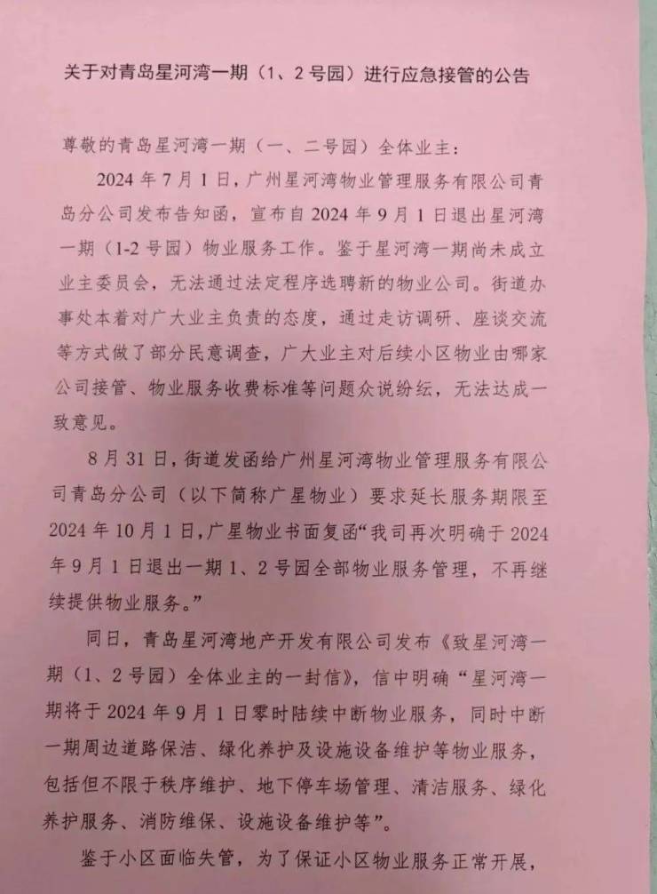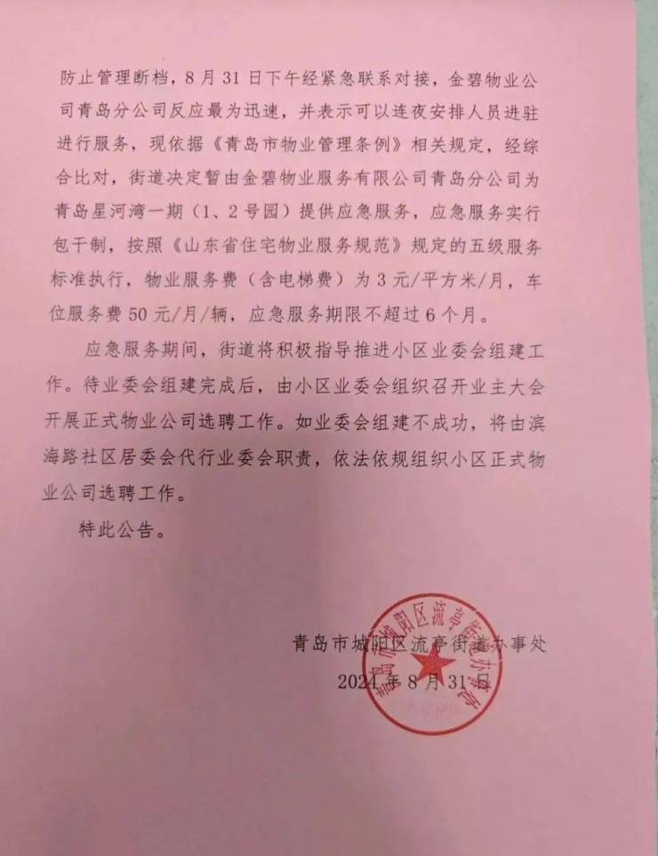 对于临时物业,街道决定暂由金碧物业服务有限公司青岛分公司为青岛星河湾一期(1、2号园)提供应急服务,应急服务实行包干制,按照《山东省住宅物业服务规范》规定的五级服务标准执行,物业服务费(含电梯费)为3元/平方米/月,车位服务费50元/月/辆,应急服务期限不超过6个月。通知如下: