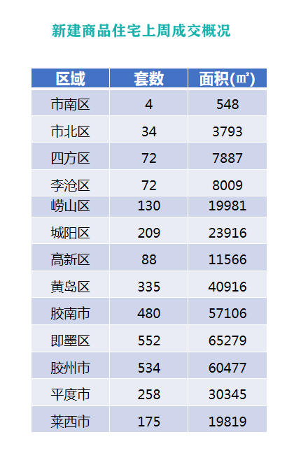 从各区成交情况来看,上周即墨区新建商品住宅成交552套,成交面积为65279㎡,位列上周各片区新建商品住宅成交面积和成交套数首位;胶州市以成交534套,成交面积60477㎡的成绩名列第二;原胶南市以单周成交480套,成交面积57106㎡列第三位;