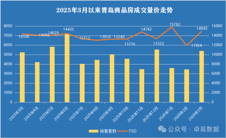 二手房成交套15545套(住宅14512套),二手房交易量明显高于新房,新房刚性需求流向二手房。青岛新房、二手房2026年1-3月合计成交约27999套。