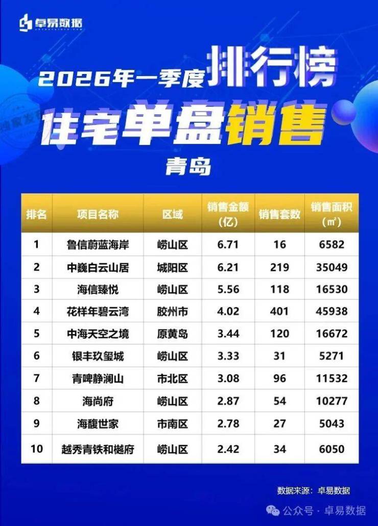 在新建住宅市场中,2026年1-3月“顶豪”鲁信蔚蓝海岸6.71亿;中巍白云山居6.21亿;海信臻悦5.56亿。