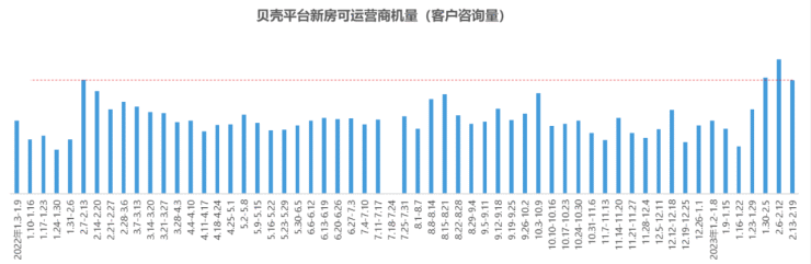 广州楼市出现明显回暖的时间点出现在开年后,从1月29日后,咨询量开始逐步回到高点。据贝壳研究院数据,近3周广州客户咨询量均维持在2022年以来高位水平。