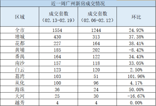 据阳光家缘数据,上周(2月13日-19日)广州共成交1554套新房,相较于前一周(2月6日-12日)的1244套环比上涨24.92%,涨幅较为稳定。