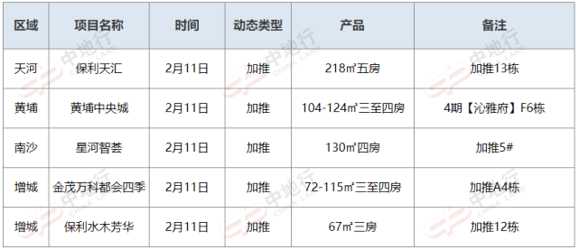 据广州中地行统计,进入2月份以来,包括天河的保利天汇(加推13栋楼)、黄埔的黄埔中央城(加推4期沁雅府F6栋)、南沙的星河智荟(加推5号楼)、增城的金茂万科都会四季(加推A4栋楼)等项目均加推了新房源。