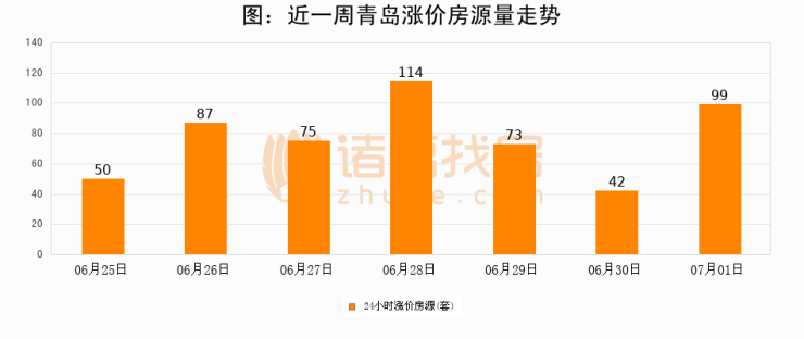 根据诸葛找房数据显示,青岛24小时涨价房源量为99套,较06月30日增加57套,环比上涨135.7%。与此同时,涨价房源占比小幅扩大,业主信心有所提升。