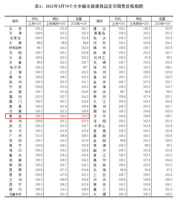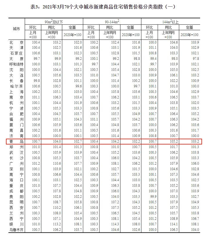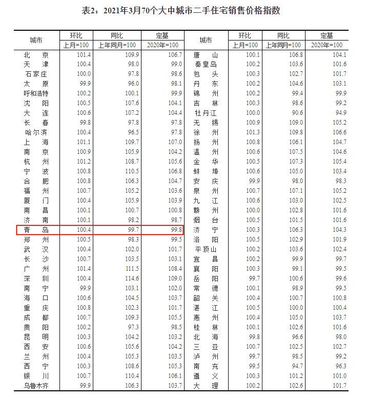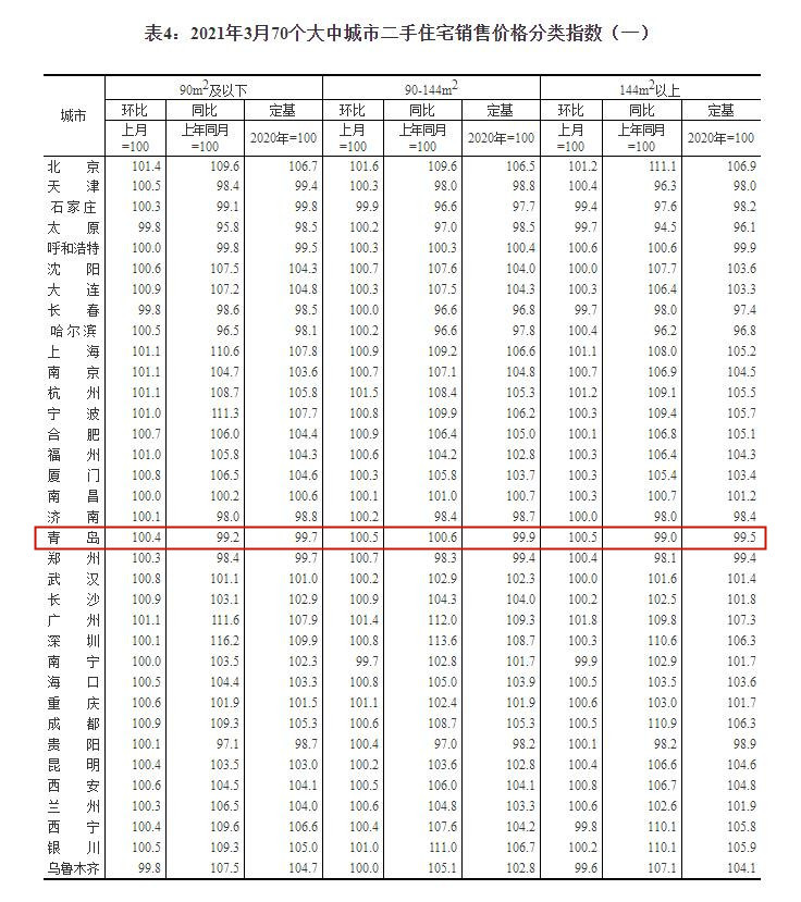 4月16日,国家统计局发布了2021年3月份70个大中城市商品住宅销售价格变动情况。数据显示,全国70个大中城市中,新建商品住宅销售价格环比下降的城市有6个,上涨的城市有62个,持平的城市有2个;较高涨幅为1%,较低为下降0.4%。二手住宅销售价格环比下降的城市有9个,上涨的城市有58个,持平的城市有3个;较高涨幅为1.4%,较低为下降0.5%。 在全国房地产市场的整体平稳运行中,青岛3月份市场热度持续走高,其中新建商品住宅和二手住宅销售价格都迎来环比增长,涨幅分别为0.5%和0.4%。