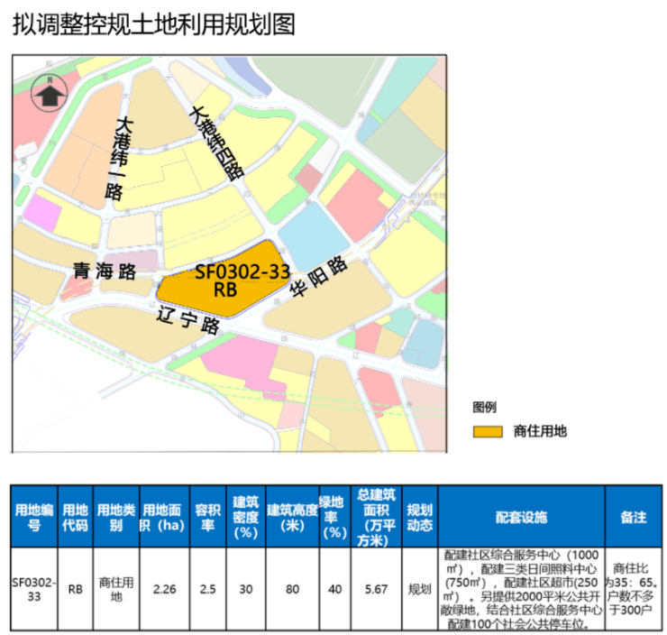 1.SF0302-33地块用地性质由商业商务混合用地调整为商住用地,容积率由4.3降至2.5,商住比为35:65。总建筑面积由9.72万㎡减少到5.67万㎡。配建社区综合服务中心 (1000㎡),配建三类日间照料中心(750㎡),配建社区超市(250㎡)。另提供2000㎡公共开敞绿地,结合社区综合服务中心配建100个社会公共停车位。