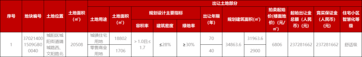 地块位于城阳区城阳街道靖城路西、文阳路北,占地面积20508㎡(住宅18802㎡、商业1706㎡),容积率1.7,建筑面积34863.6㎡(住宅31963.6㎡、商业2900㎡)起拍楼面价6806元/㎡,起拍价2.37亿,保证金2.37亿。
