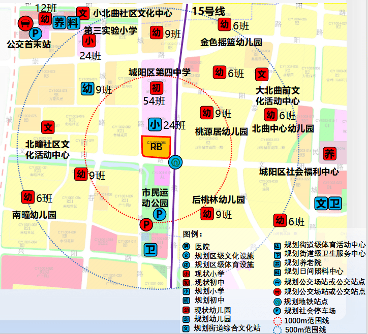教育与医疗:地块北侧为城阳第四中学,西北侧有第三实验小学,地块周边有多所现状幼儿园。地块周边规划有24班小学、9班幼儿园,街道级卫生服务中心,养老院,日间照料中心等。