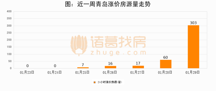 根据诸葛找房数据显示,青岛24小时涨价房源量为303套,较01月28日增加243套,环比上涨405%。与此同时,涨价房源占比小幅扩大,业主信心有所提升。