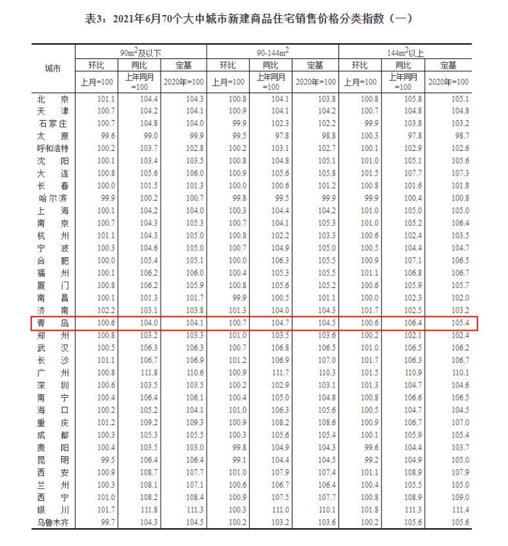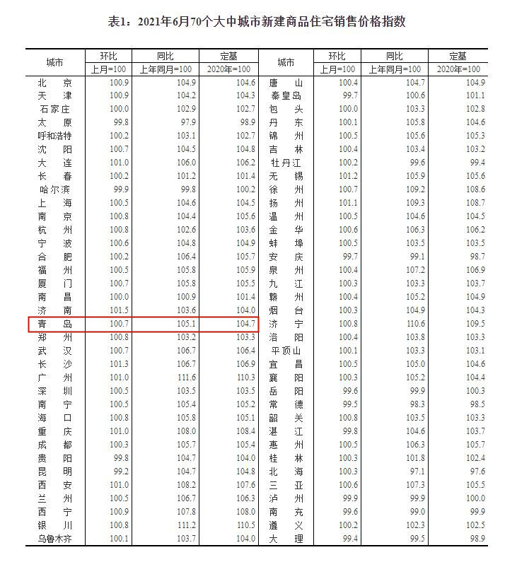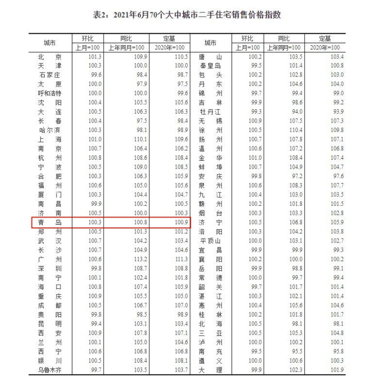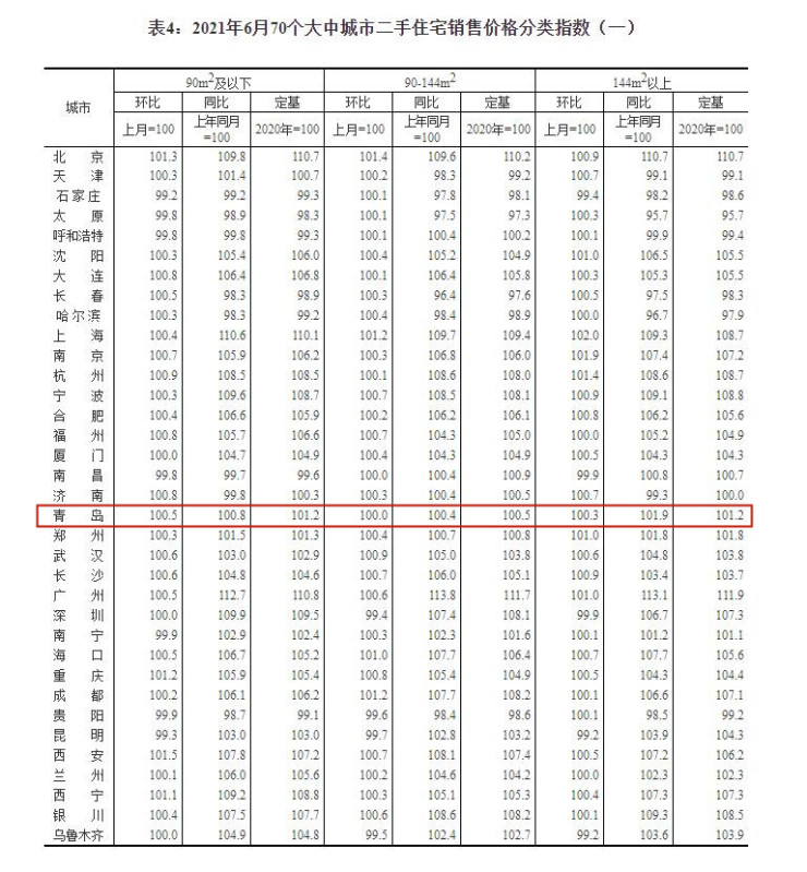 7月15日,国家统计局发布了2021年6月份70个大中城市商品住宅销售价格变动情况。数据显示,全国70个大中城市中,新建商品住宅销售价格环比下降的城市有12个,上涨的城市有55个,持平的城市有3个;较高涨幅为1.5%,较低为下降0.8%。二手住宅销售价格环比下降的城市有16个,上涨的城市有48个,持平的城市有6个;较高涨幅为1.3%,较低为下降0.7%。青岛6月份的新房和二手房市场热度持续走高,新房销售价格环比增长了0.7%,二手住宅销售价格环比增长0.3%,在省内四市中销售价格的环比上涨幅度相较平稳。