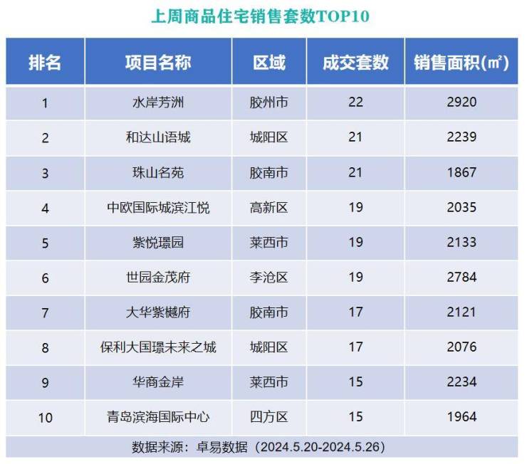从各项目成交套数来看,位于胶州市的水岸芳洲以成交22套的成绩列榜单首位。