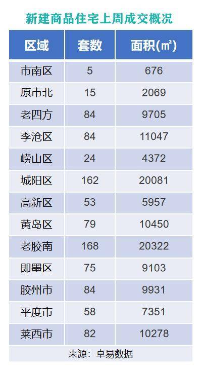从各区成交情况来看,上周原胶南市新建商品住宅以成交面积20322㎡的成绩,位列上周各片区新建商品住宅成交面积榜首位;城阳区以成交面积20081㎡的成绩,位列成交面积榜第二位;李沧区以成交面积11047㎡的成绩,位列成交面积榜第三位。
