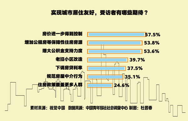 上周,中国青年报社社会调查中心联合问卷网(wenjuan.com),对1512名35岁以下青年进行的一项调查显示,实现城市居住友好,57.5%的受访青年希望房价进一步得到控制,53.8%的受访青年期待增加公租房等保障性住房房源。