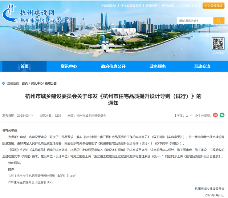 杭州的“好房子”标准终于正式亮相。继去年末杭州优化建设项目容积率及相关指标计算规则后,今年2月19日,杭州市政府常务会议研究了《杭州市进一步开展住宅品质提升工作的实施意见》(以下简称《实施意见》)等事项。3月11日,《实施意见》正式出台,并配套制订《杭州市住宅品质提升设计导则(试行)》(以下简称《导则》),将于4月1日起施行。