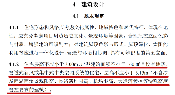 记者注意到,《导则》从基本规定、规划布局、建筑设计、结构设计、给排水设计、电气设计、暖通设计、智能化设计、室外环境设计、运营维护十个方面,对杭州市新建商品住宅项目的建筑设计给出了更为详尽的指导。此外,还对套内空间等提出了更细致的要求,诸如“高层住宅底层必须架空,且架空层高度不小于4米”“在住宅层高不小于3米的基础上,大户型要求层高不小于3.15米”“鼓励结合景观设置风雨连廊”等。