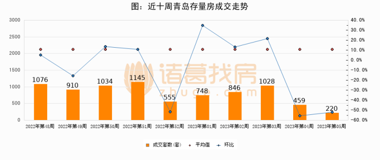 存量房方面,第05周青岛存量房成交220套,较上周减少239套,环比下降52.1%。从近十周成交走势来看,周均成交套数为802套,本周低于平均水平72.6%。