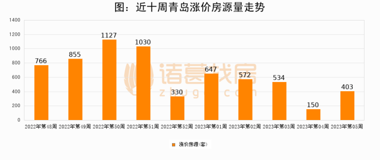 从调价房源来看,第5周青岛涨价房源403套,较上周上涨168.7%。与此同时,5周涨价房源占比回落9.56个百分点,业主信心小幅波动,购房者可则需入市。