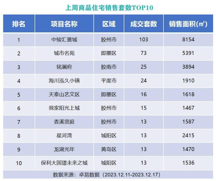 从各项目成交套数来看,位于胶州市的中骏汇景城以成交103套的成绩列榜单首位;位于即墨区的城市名苑以成交73套成绩上榜第二位;位于西海岸新区的铭澜府以成交25套的成绩列榜单第三位。