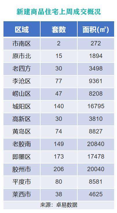 从各区成交情况来看,上周原胶南市新建商品住宅以成交149套,成交面积20840㎡的成绩,位列上周各片区新建商品住宅成交面积榜首位;胶州市以成交206套,成交面积20040㎡的成绩,位列成交套数榜第一位。