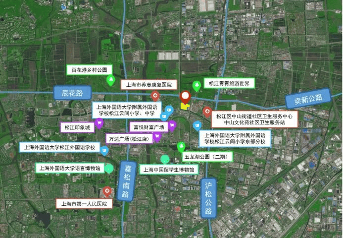 该地块周边道路交通有周边道路有崧泽大道、崧泽高架、北青公路、赵重公路等;基础教育包括九年一贯制上海师范大学附属青浦实验学校、重固小学、重固幼儿园、寿丰幼儿园等;医疗卫生包括重固社区卫生服务中心和红十字护理医院等;大型公共空间包括文心公园、河泾公园等;文化体育设施包括重固镇体育公园、重固综合体育场、社区文化活动中心。