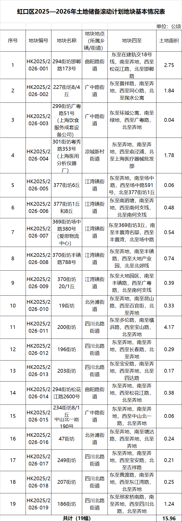 据上海市规划和自然资源局去年7月公布的《虹口区2025—2026年土地专项准备滚动计划地块基本情况表》,今明两年,虹口区储备推出的地块合计19宗,涉及曲阳路街道、广中路街道、北外滩街道、四川北路街道等,土地面积合计15.96万平方米。