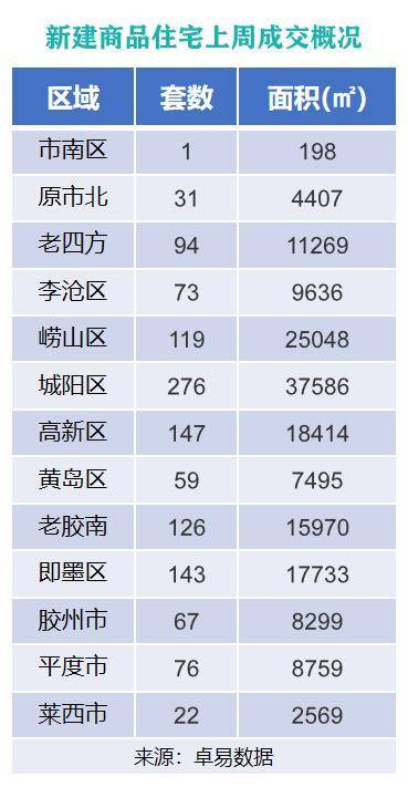 从各区成交情况来看,上周城阳区新建商品住宅以成交面积37586㎡的成绩,位列上周各片区新建商品住宅成交面积榜首位;崂山区以成交面积25048㎡的成绩,位列成交面积榜第二位;高新区以成交面积18414㎡的成绩,位列成交面积榜第三位。