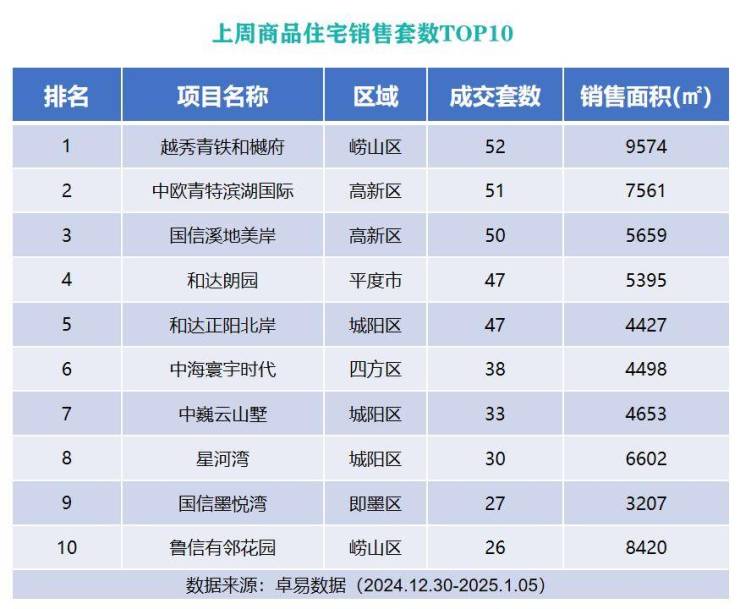 从各项目成交套数来看,位于崂山区的越秀青铁和樾府以成交52套的成绩列榜单首位;位于高新区的中欧青特滨湖国际以成交51成绩上榜第二位;位于高新区的国信溪地美岸以成交50套的成绩列榜单第三位。