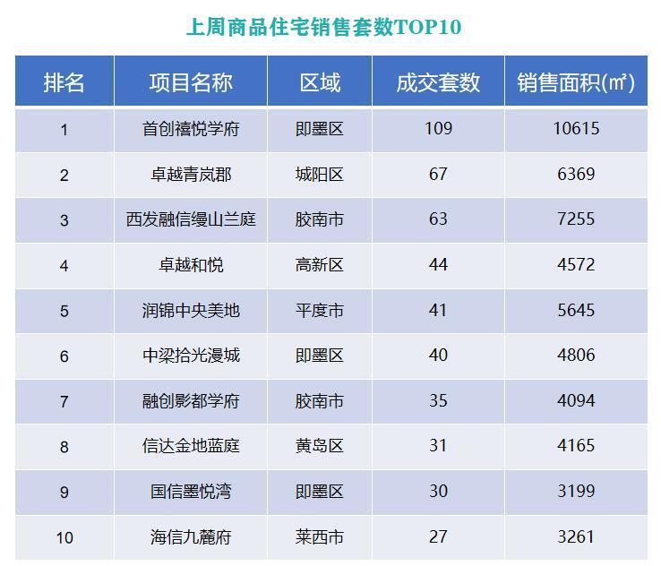 从各项目成交情况(成交套数)来看,位于即墨区的首创禧瑞学府以成交109套,销售面积10615㎡的成绩列榜单排名前列;资料显示,项目首开入市,目前几乎售罄,首开均价11000元/㎡。