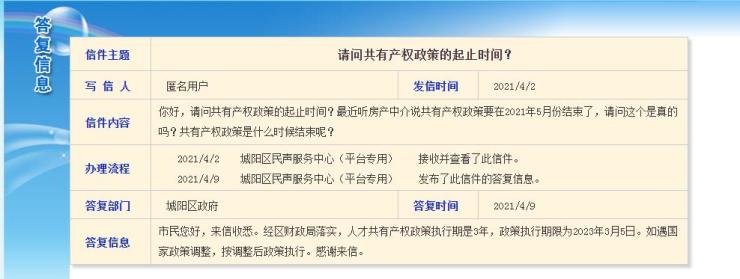 近日,在政府信箱中有人问到城阳区共有产权政策的起止时间。