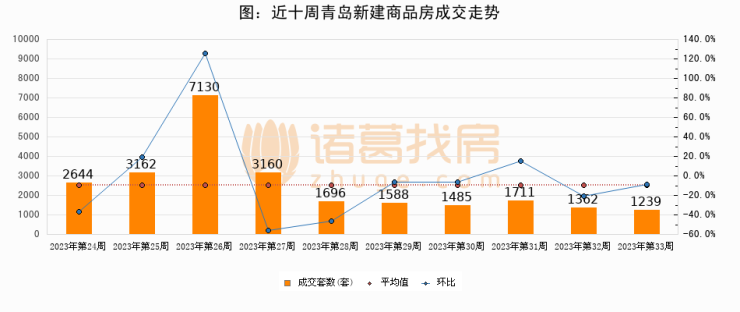 进入2023年第33周(08月07日-08月13日),青岛新建商品房成交1239套,较上周减少123套,环比下降9%