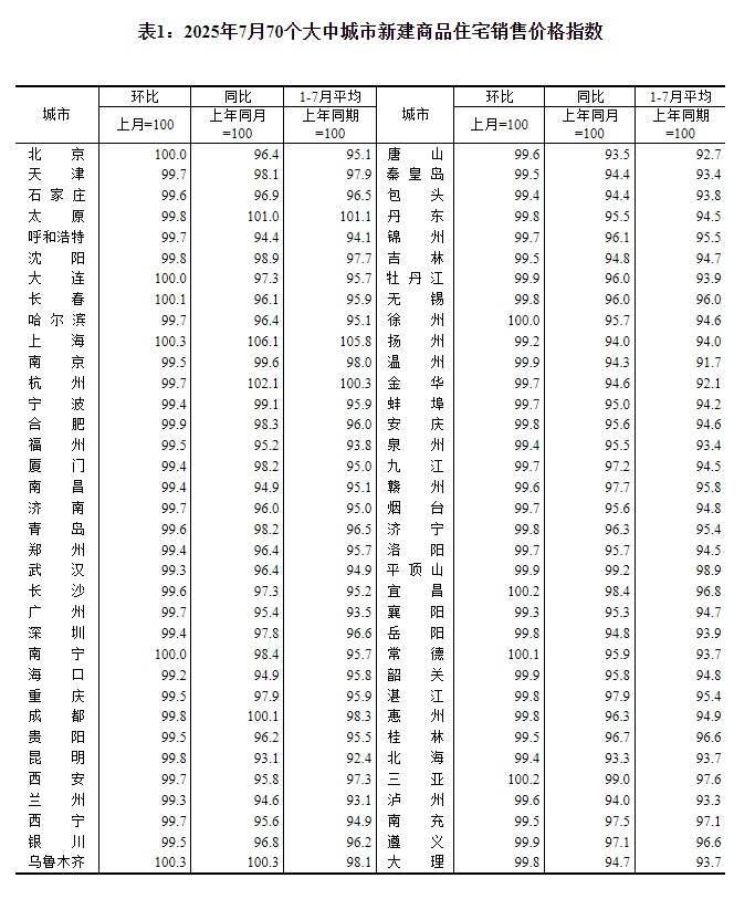 8月15日,国家统计局发布2025年7月份70个大中城市商品住宅销售价格变动情况。数据显示,各线城市商品住宅销售价格环比下降,同比降幅整体有所收窄。新房市场中,6城价格上涨,上海以0.3%的环比涨幅领涨全国;二手房市场则仍处于深度调整,仅太原1城房价环比上涨。