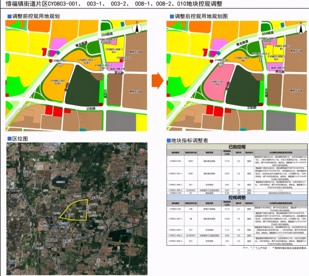 变更内容主要包括:CY0803- 001地块用地性质由商住混合用地调整为新型产业用地,容积率由2.0调整为2.5;将CY0803-008-1地块分为两个地块,用地性质和容积率不变。原规划的社区农贸市场(CY0803-010地块) 并入居住地块统一开发。北侧科研商务工业混合用地(CY0803 -008-2地块)面积由0.64公顷调整为0.84公顷,容积率不变。