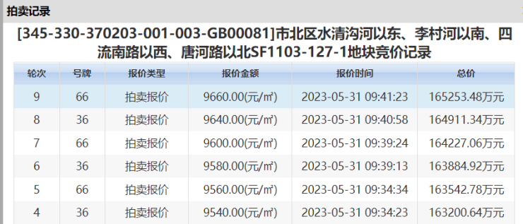 最先出价的是环海湾,海信、保利、青城和招商出价比较积极,最后成了青城和青特&建信2家本土“青”字头的厮杀,青城和环海湾间,青城和招商……,本场出价速度比较快不拖泥带水,大家基本奔着熔断去的。