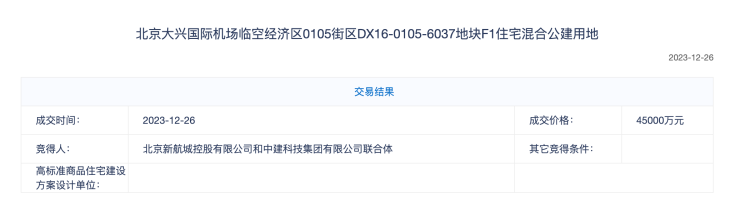 北京大兴国际机场临空经济区0105街区DX16-0105-6037地块的用地性质为F1住宅混合公建用地,土地面积19113.12平方米,规划建筑面积38226.24平方米,起始总价45000万元。该地块由北京新航城控股有限公司和中建科技集团有限公司联合体以底价摘得。