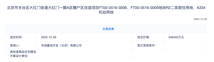 根据成交结果,该地块最终由华润置地开发(北京)有限公司以上限价格348450万元摇号成交,成交楼面价65104元/平方米,溢价率15%。