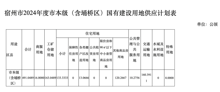 计划显示,宿州市2024年度市本级(含埇桥区)国有建设用地供应总量为491.0489公顷,其中:商服用地16公顷、工矿仓储用地163.0489公顷、公共管理与公共服务用地10.2756公顷、交通运输用地160.3911公顷、特殊用地8.0000公顷、住宅用地133.3333公顷(商品住房用地总量120.2667公顷;保障性安居工程用地13.0666公顷)。新增建设用地量控制在112.5660公顷,鼓励和引导利用存量建设用地378.4829公顷。