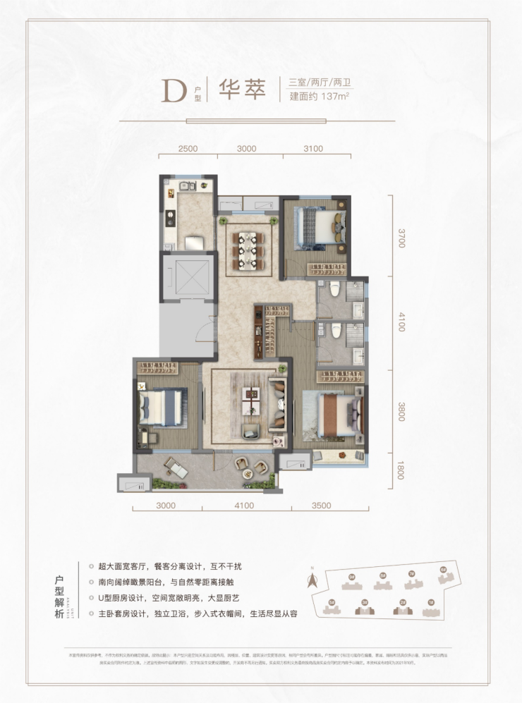 建面137㎡奢阔三居,餐客分离,南北宽阔设计,尽享每一寸私人空间。