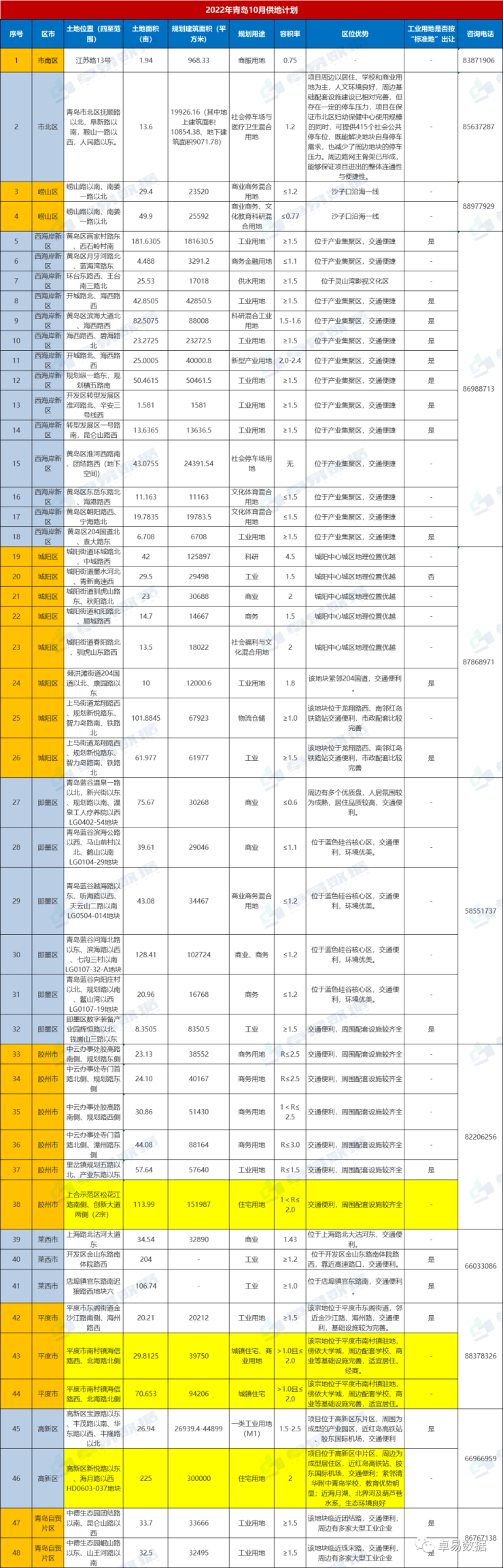 来源:卓易数据/王公子10月12日,青岛自然资源和规划局发布公告:全市10月份拟招拍挂出让地块48宗,总面积2317亩,其中工矿仓储用地19宗,面积约1014亩;新型产业用地(M0)1宗,面积约25亩;商服用…