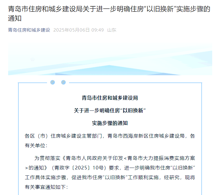 5月6日上午,青岛市住房和城乡建设局发布《关于进一步明确住房“以旧换新”实施步骤》的通知。