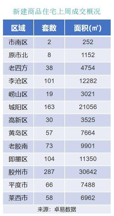 从各区成交情况来看,上周胶州市新建商品住宅以成交面积30642㎡的成绩,位列上周各片区新建商品住宅成交面积榜首位;城阳区以成交面积21056㎡的成绩,位列成交面积榜第二位;李沧区以成交面积12282㎡的成绩,位列成交面积榜第三位。
