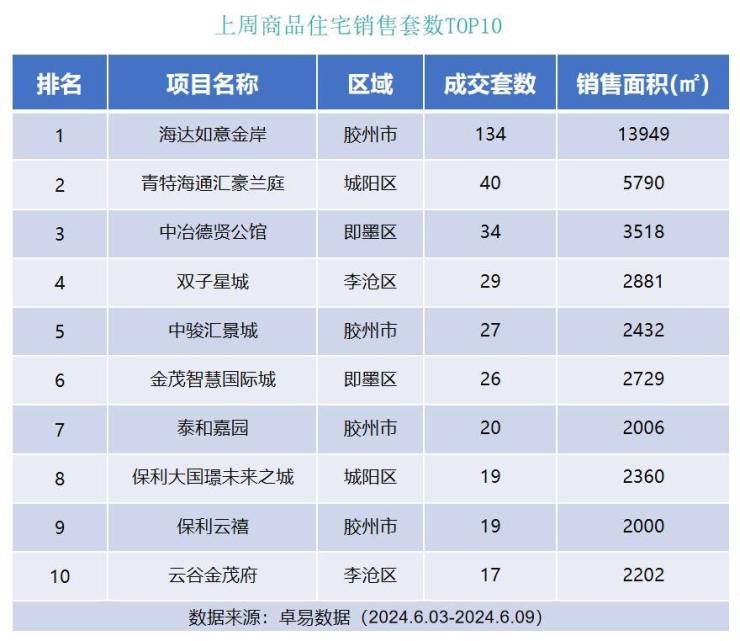 从各项目成交套数来看,位于胶州市的海达如意金岸以成交134套的成绩列榜单首位;位于城阳区的青特海通汇豪兰庭以成交40套成绩上榜第二位;位于即墨区的中冶德贤公馆以成交34套的成绩列榜单第三位。