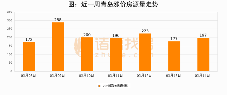 根据诸葛找房数据显示,青岛24小时涨价房源量为197套,较02月13日增加20套,环比上涨11.3%。与此同时,涨价房源占比小幅扩大,业主信心有所提升。