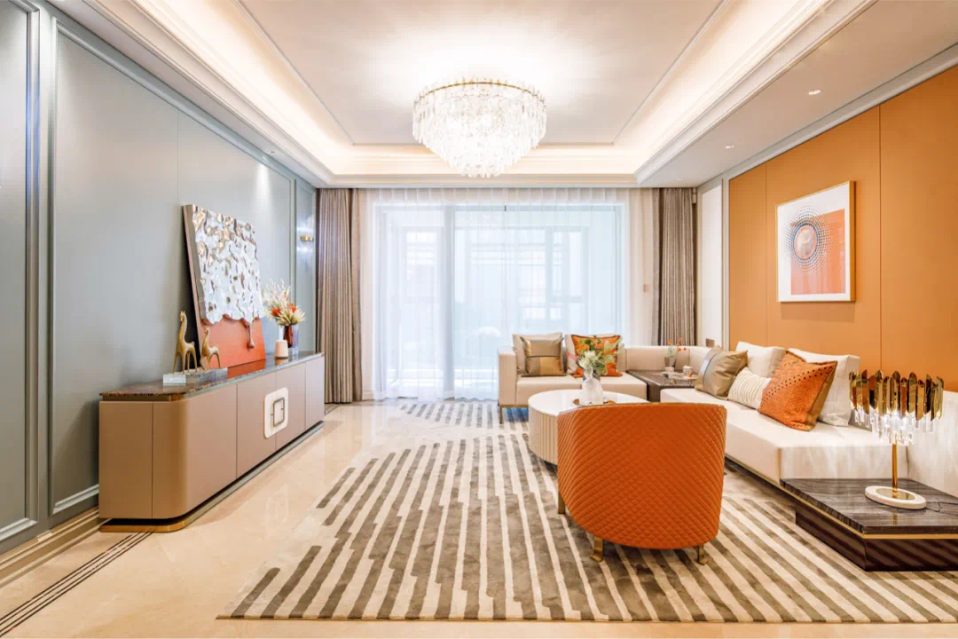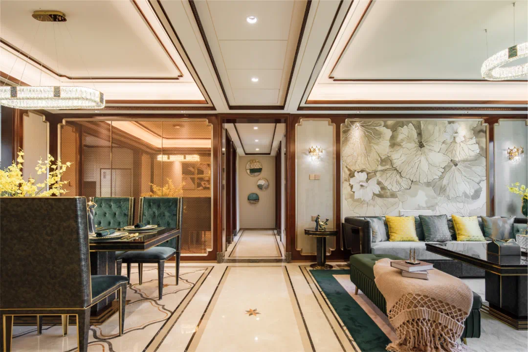 真正的豪宅,是在时代进化中,永远秉承着自我的独到信仰。海尚府,以打造TOP系标杆产品的初心,以优质精工,匹配塔尖人士对生活品质的苛求。入口玄关背景墙,凸显皇家府邸风范;源自故宫九龙腾云图的地面大理石拼花,展现金玉满堂吉祥寓意;玄关采用稀缺的流光影木,尽显奢华质感;墙面木作线条框线造型提炼自故宫门扇,与壁布优质结合;吊顶层次分明,注重细节打磨,极尽精湛匠心工艺;搭配严苛甄选的高级知名品牌,处处彰显着海尚府TOP系产品,精工时尚府邸的艺术格调。