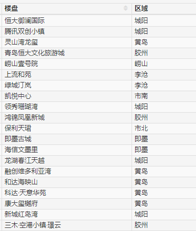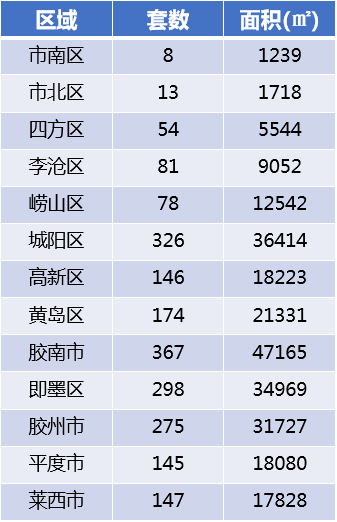 从各区成交情况来看,上周原胶南市新建商品住宅成交367套,成交面积为47165㎡,位列上周各片区新建商品住宅成交面积和成交套数首位;城阳区以成交326套,成交面积36414㎡的成绩名列第二;即墨区以单周成交298套,成交面积34959㎡列第三位。