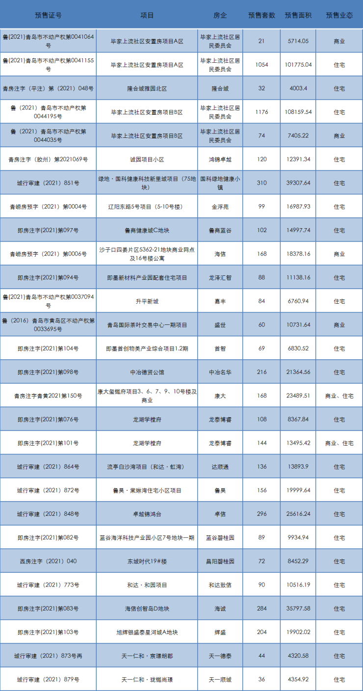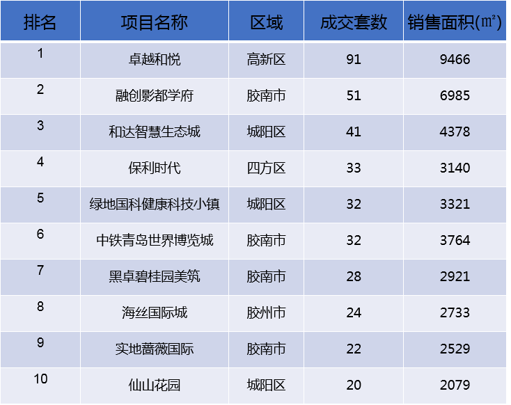 排在第四到第十位的分别是保利时代、绿地国科健康科技小镇、中铁青岛世界博览城、黑卓碧桂园美筑、海丝国际城、实地蔷薇国际、仙山花园。从各区及各项目的成交情况来看,上周新建商品住宅成交以近郊各区项目为主,主城区仅原四方区保利时代1个项目上榜。