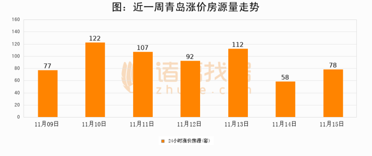 根据诸葛找房数据显示,青岛24小时涨价房源量为78套,较11月14日增加20套,环比上涨34.5%。与此同时,涨价房源占比小幅扩大,业主信心有所提升。