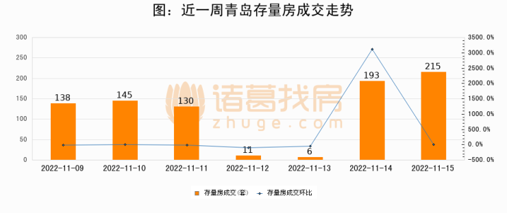 从存量房来看,2022年11月15日青岛存量房单日成交215套,比昨日增加22套,环比上涨11.4%。从近一周存量房成交来看,青岛存量房日均成交套数为119套,其中11月15日成交量最高为215套,11月15日单日成交215套,高于近一周平均水平80.7%。